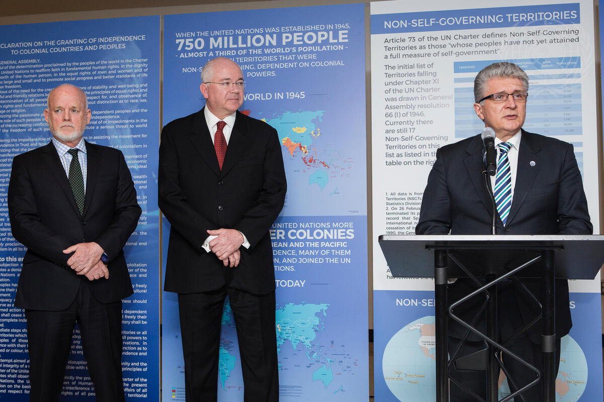 Miroslav Jenca, Assistant Secretary-General for Political Affairs (right), makes remarks during the opening, while Rafael Darío Ramírez Carreño, Permanent Representative of Venezuela to the UN and Chair of the Special Committee on Decolonization (centre); and Peter Thomson, President of the seventy-first session of the General Assembly, look on.