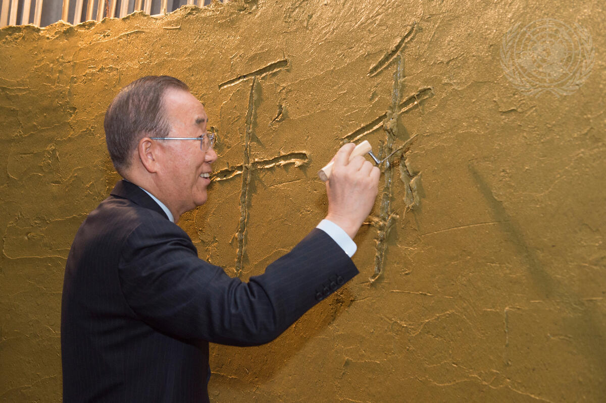 The Secretary-General is pictured inscribing “Heiwa” [??], meaning “peace”.