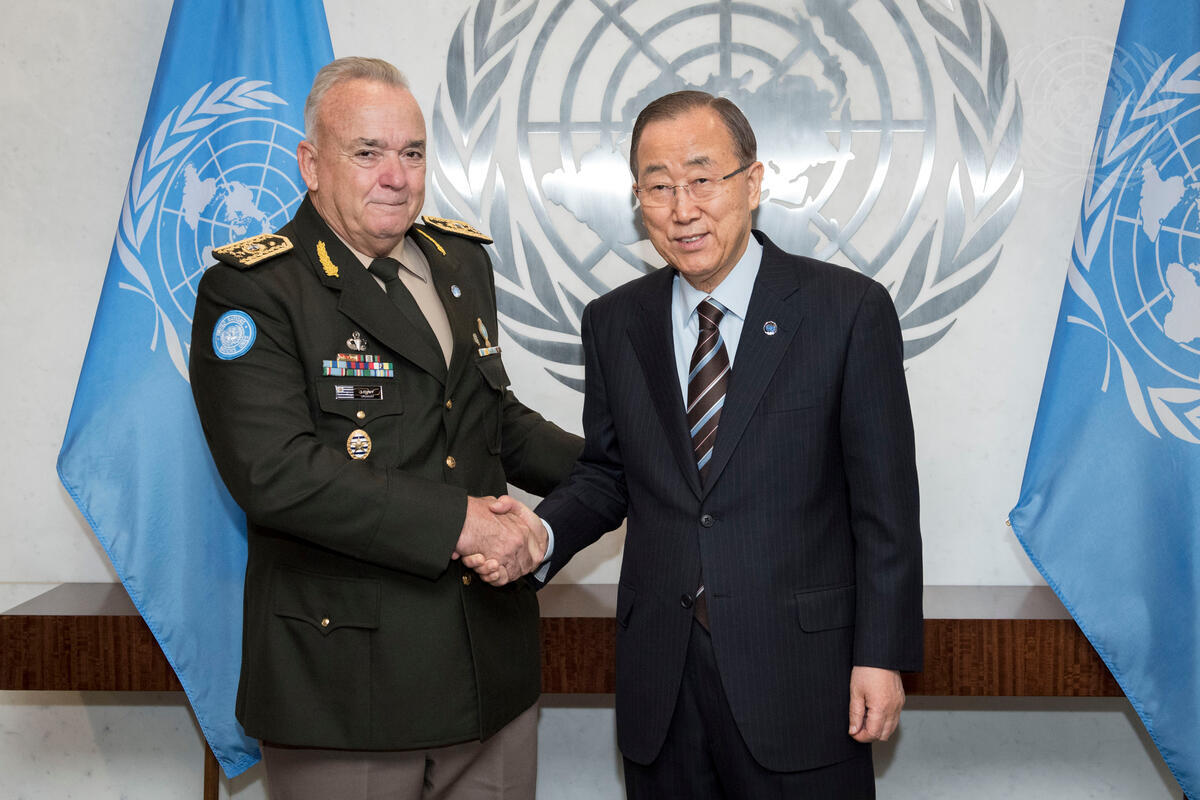 Secretary-General Ban Ki-moon (right) congratulates Lieutenant General Carlos Humberto of Uruguay after his swearing in as Military Adviser for Peacekeeping Operations.
