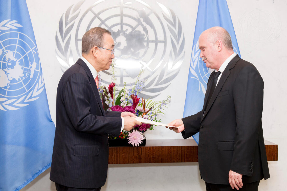 Feridun Hadi Sinirlioglu (right), new Permanent Representative of Turkey to the United Nations, presents his credentials to Secretary-General Ban Ki-moon.