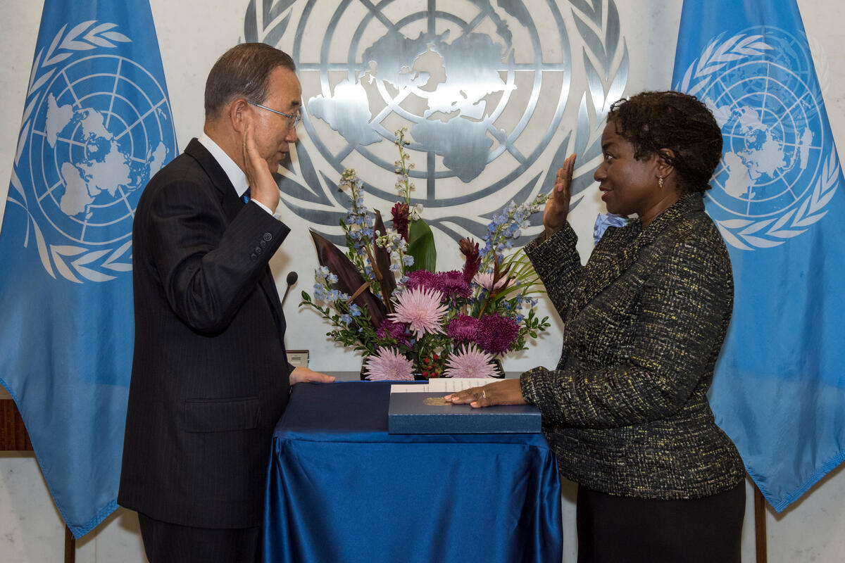 Secretary-General Ban Ki-moon (left) swears in Natalia Kanem as Assistant Secretary-General and Deputy Executive Director of the United Nations Population Fund.