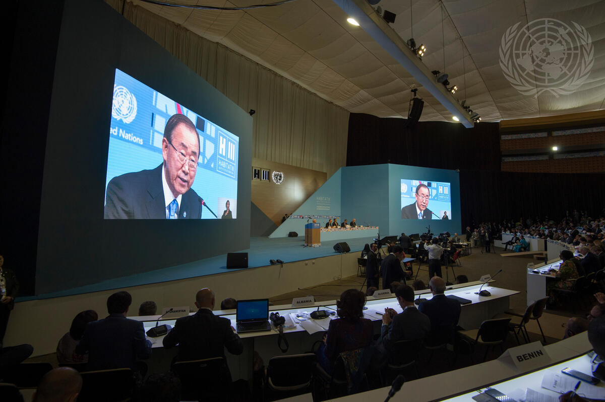 Secretary-General Ban Ki-moon (second left) attends opening of the United Nations Conference on Housing and Sustainable Urban Development, HABITAT III. Also on the podium: Joan Clos (left), Secretary-General of HABITAT III and Executive Director of the United Nations Human Settlements Programme (UN-Habitat); Rafael Correa (centre), President of the Republic of Ecuador; and Peter Thomson (right), President of the seventy-first session of the General Assembly.