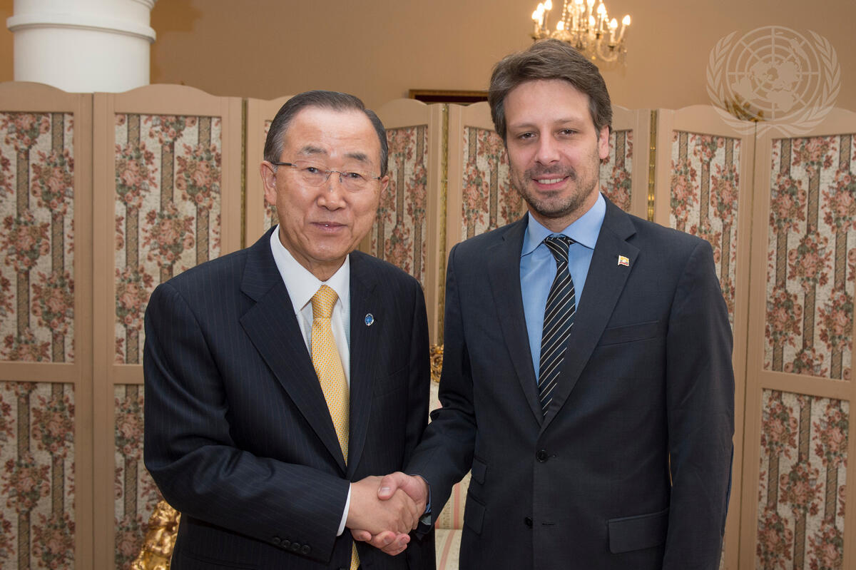 Secretary-General Ban Ki-moon (left) meets with Guillaume Long (right), Minister for Foreign Affairs of Ecuador.