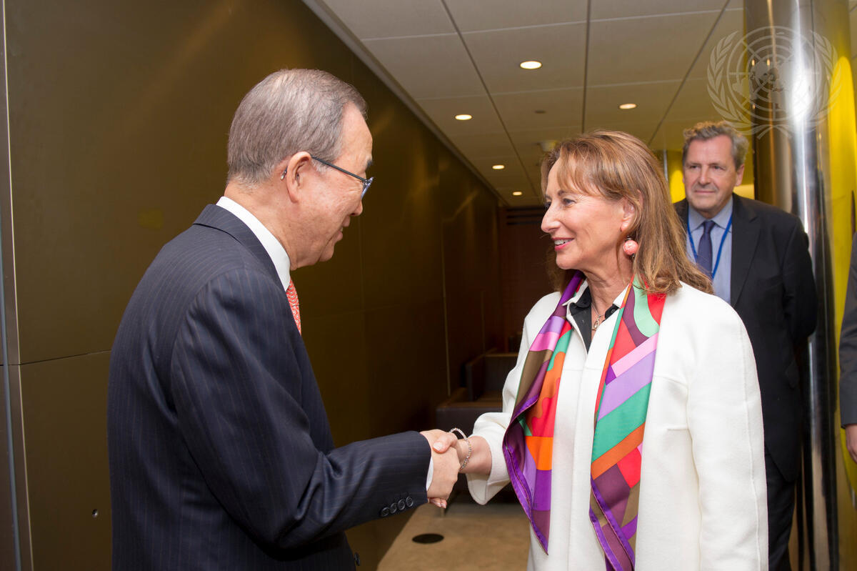 Secretary-General Ban Ki-moon (left) meets with Ségolène Royal, Minister of the Environment, Energy and Marine Affairs of France, and President of COP21.