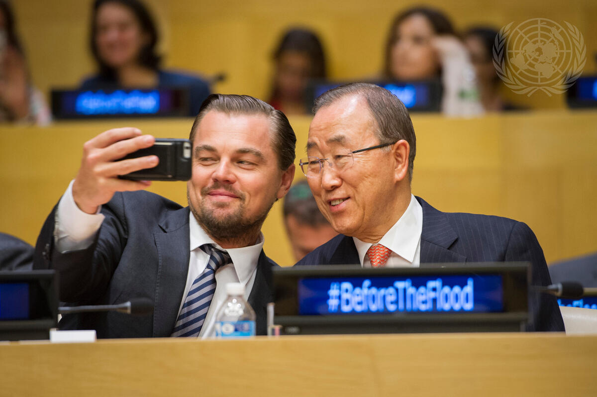 Secretary-General Ban Ki-moon (right) and Leonardo DiCaprio, actor and UN Messenger of Peace, attend the screening of the documentary film ""Before the Flood"".
