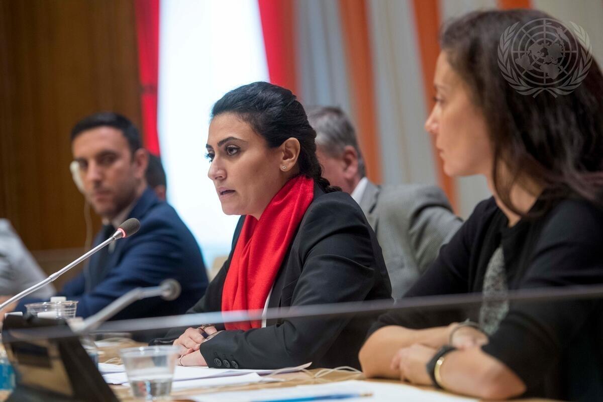 Marya Farah (centre), of the organization Al-Haq, speaking during the briefing.