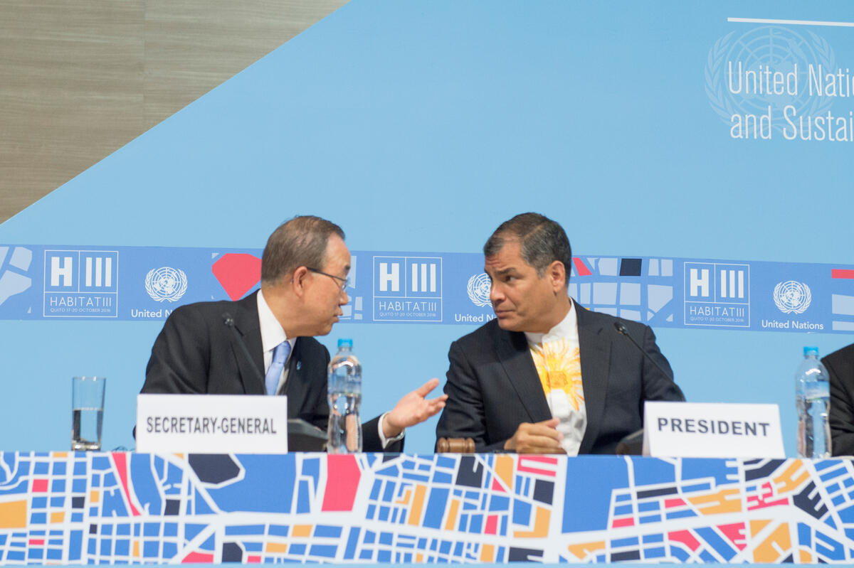 Secretary-General Ban Ki-moon (left) attends opening of the United Nations Conference on Housing and Sustainable Urban Development, HABITAT III. On the right, Rafael Correa, President of Ecuador.