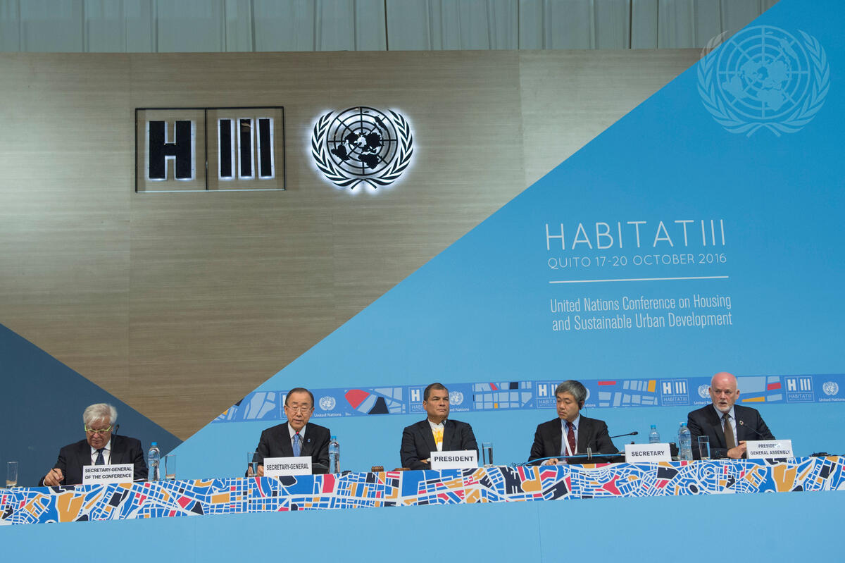 Secretary-General Ban Ki-moon (second left) attends opening of the United Nations Conference on Housing and Sustainable Urban Development, HABITAT III. Also on the podium: Joan Clos (left), Secretary-General of HABITAT III and Executive Director of the United Nations Human Settlements Programme (UN-Habitat); Rafael Correa (centre), President of the Republic of Ecuador; and Peter Thomson (right), President of the seventy-first session of the General Assembly.
