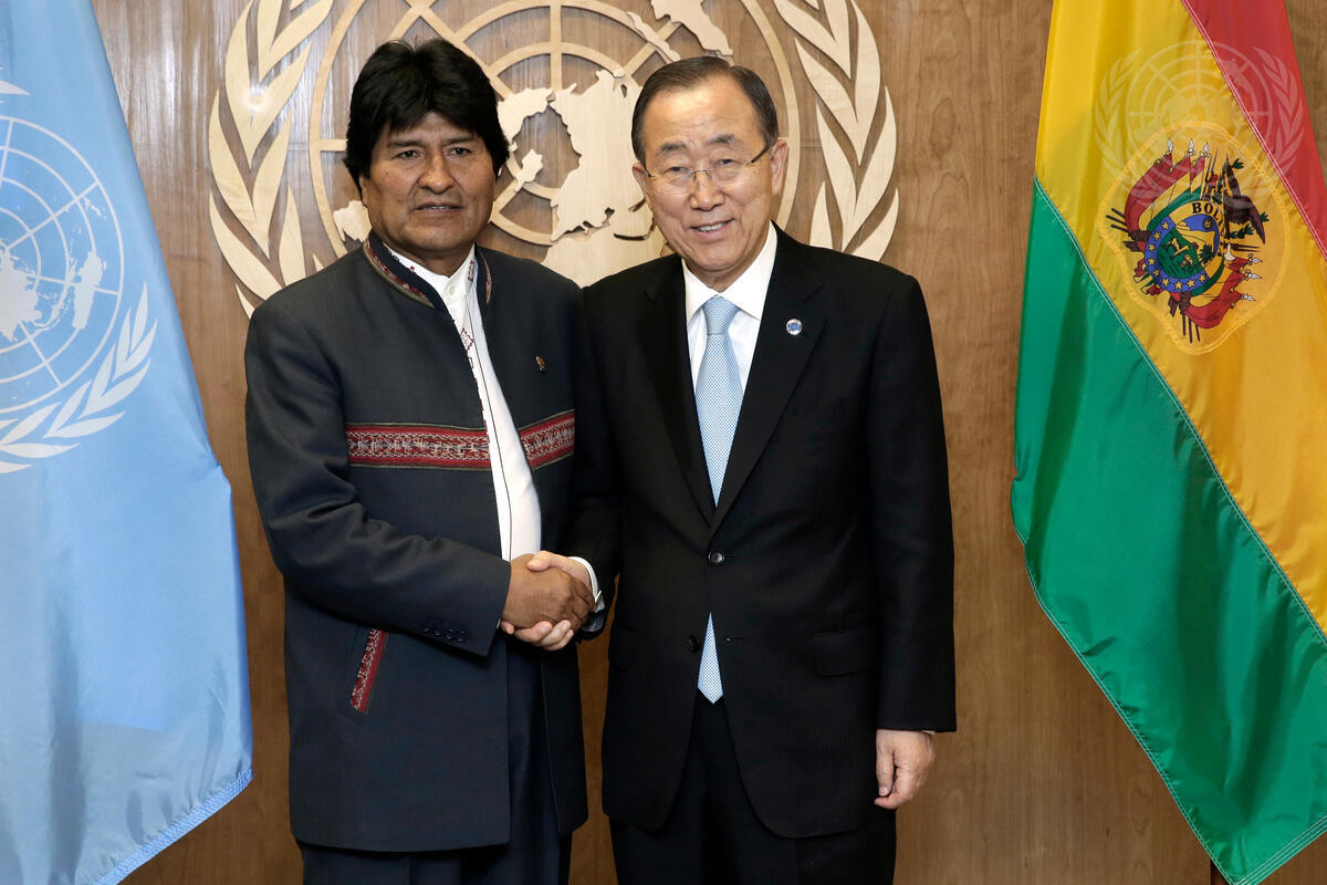 Secretary-General Ban Ki-moon (right) meets with Evo Morales Ayma, President of the Plurinational State of Bolivia.