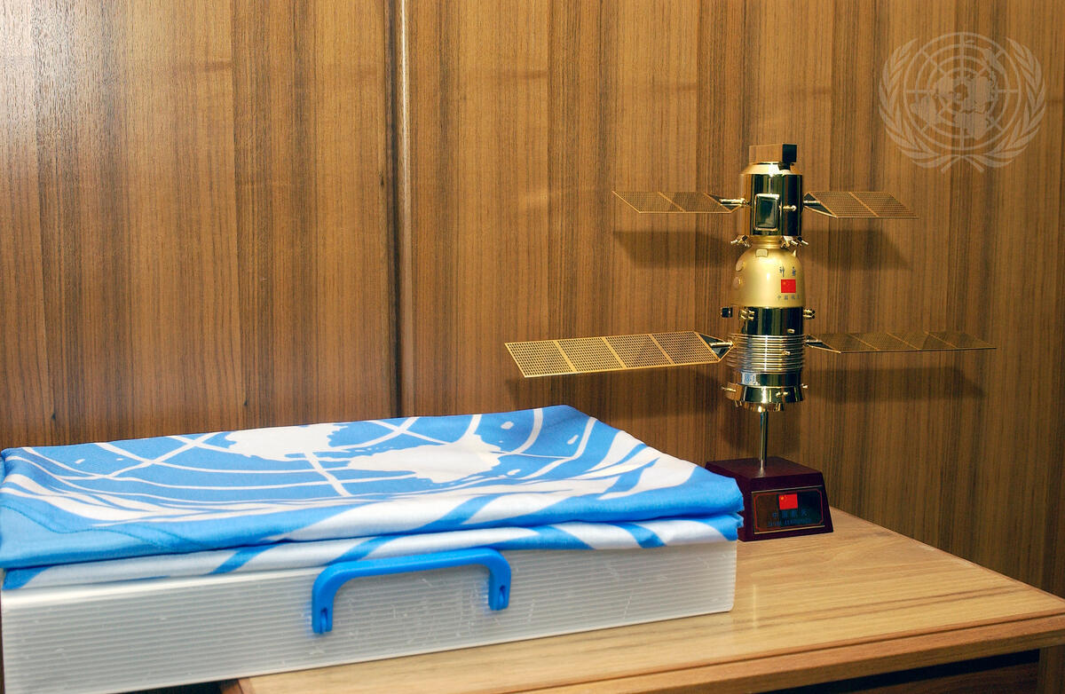 " The United Nations flag that was taken into space by China's first astronaut Col. Yang Liwei, was presented to the Secretary-General by the astronaut today.