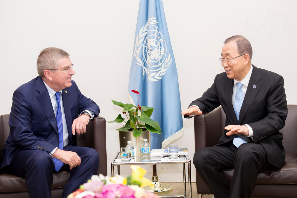 Secretary-General Ban Ki-moon (right) meets with Thomas Bach, President of the International Olympics Committee (IOC).