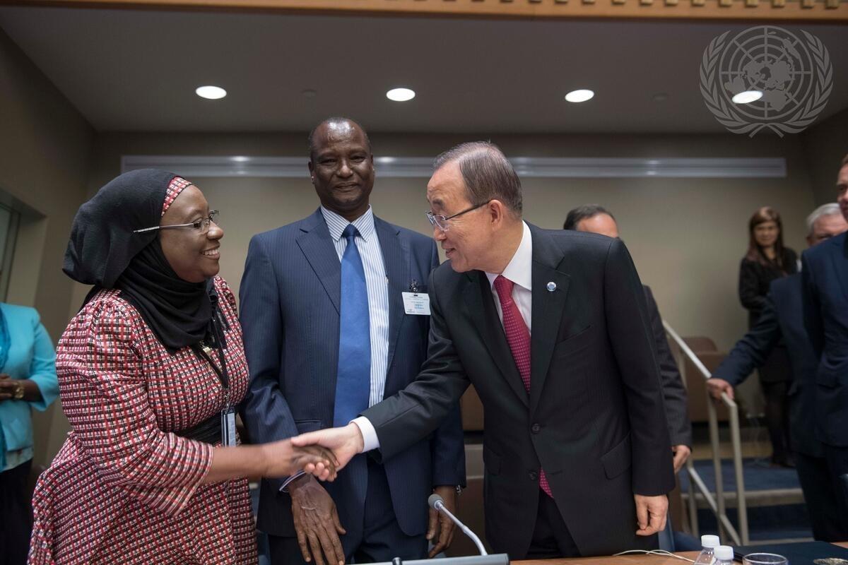 Secretary-General Ban Ki-moon (right) greets participants at the High-Level Event on the Humanitarian Situation in South Sudan.