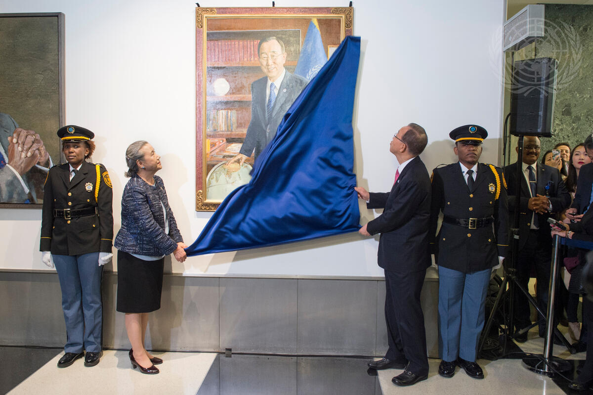Secretary-General Ban Ki-moon (second from right) and his wife Yoo Soon-taek (second from left), unveil the Secretary-General's portrait in the Secretariat lobby.