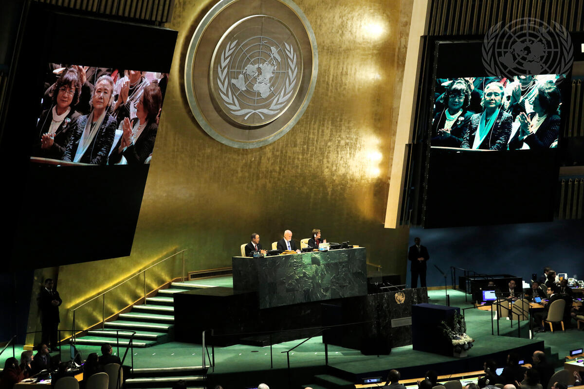 The General Assembly met to pay tribute to Secretary-General Ban Ki-moon and for the taking of the oath of office by the Secretary-General-designate António Guterres. The meeting was chaired by Peter Thomson (centre on podium), President of the Assembly's seventy-first session, who is flanked by Secretary-General Ban (left) and Catherine Pollard, Under-Secretary-General for General Assembly and Conference Management. Shown at centre on screens during the meeting, Yoo Soon-taek, wife of the Secretary-General.