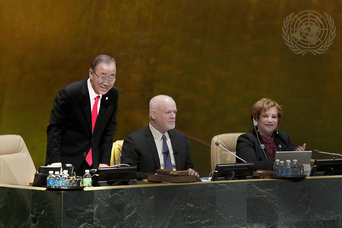 Secretary-General Ban (left) acknowledges delegates, following the adoption of a resolution by the Assembly paying tribute to his service to the Organization. Also pictured: Peter Thomson (centre), President of the Assembly's seventy-first session; and Catherine Pollard, Under-Secretary-General for General Assembly and Conference Management (DGACM).