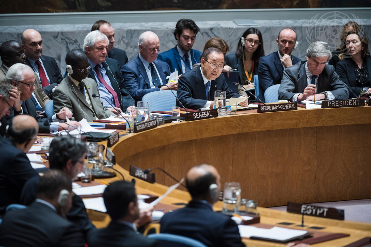 Secretary-General Ban Ki-moon (at table, second from right) addresses the Security Council on the situation in Syria.