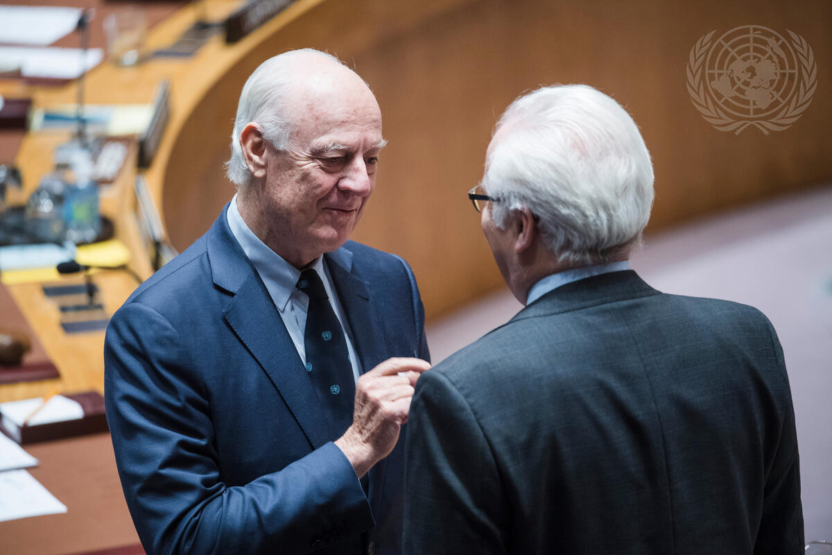 Staffan de Mistura (left), United Nations Special Envoy for Syria, speaks with Vitaly Churkin, Permanent Representative of the Russian Federation to the United Nations, before the Council begins its consideration of the situation in Syria.