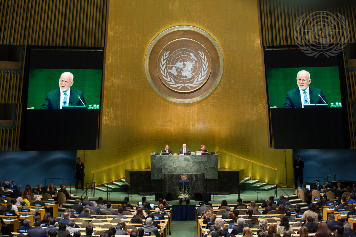 Peter Thomson (shown on screens and centre on podium), President of the Assembly's seventy-first session, chairs the meeting. He is flanked at the podium by Secretary-General Ban (left) and Catherine Pollard, Under-Secretary-General for General Assembly and Conference Management.
