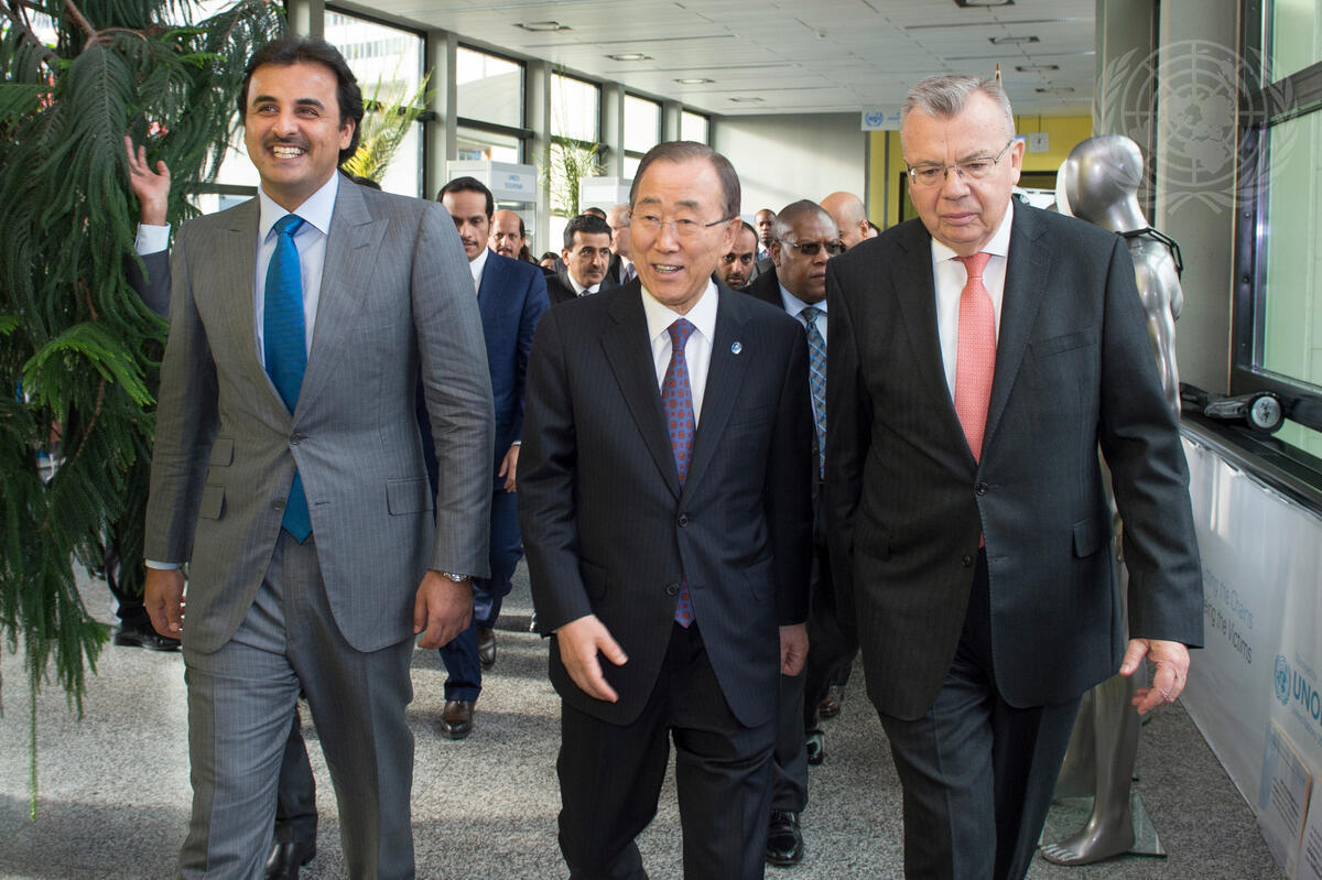 Secretary-General Ban Ki-moon (centre) meets with Sheikh Tamim bin Hamad Al-Thani (left), Amir of the State of Qatar. Also pictured: Yury Fedotov (right), Director-General of the UN Office at Vienna (UNOV) and Executive Director of the UN Office on Drugs and Crime (UNODC).