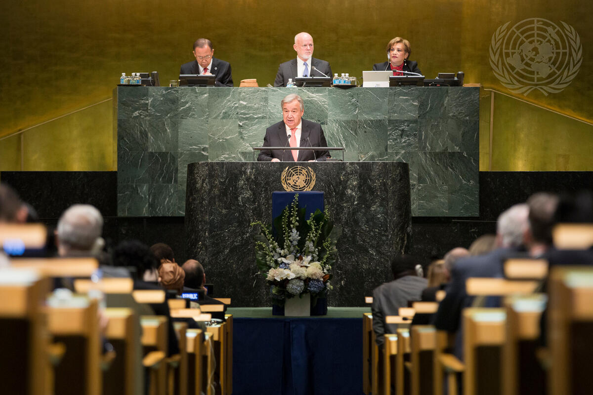 António Guterres (at podium), Secretary-General-designate of the United Nations, speaks to the 59th plenary of the seventy-first session of the General Assembly, after taking the oath of office for his five-year term, which begins on 1 January 2017. The oath was administered by Peter Thomson (upper podium, centre), President of the seventy-first session of the General Assembly, on the Charter of the United Nations. Mr. Guterres will be the ninth secretary-general of the United Nations.
