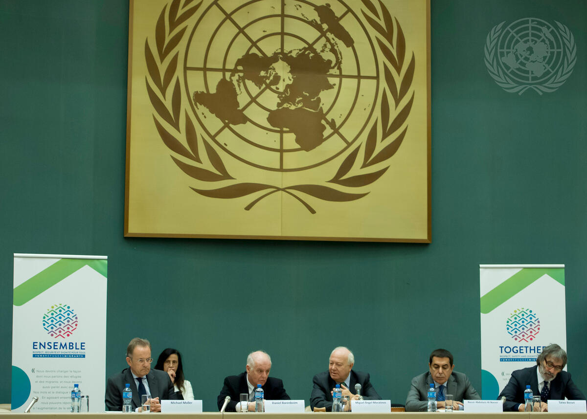 Joint Press Conference on the occasion of Human Rights Day. From left to right: Michael Møller, Director-General of the United Nations Office at Geneva; Daniel Barenboim, Conductor, founder of West-Eastern Divan Orchestra; Miguel Angel Moratinos, President of Fundación ONUART; Nassir Abdulaziz Al-Nasser, Secretary-General's High Representative for the Alliance of Civilizations; and Tatxo Benet, of Mediapro.