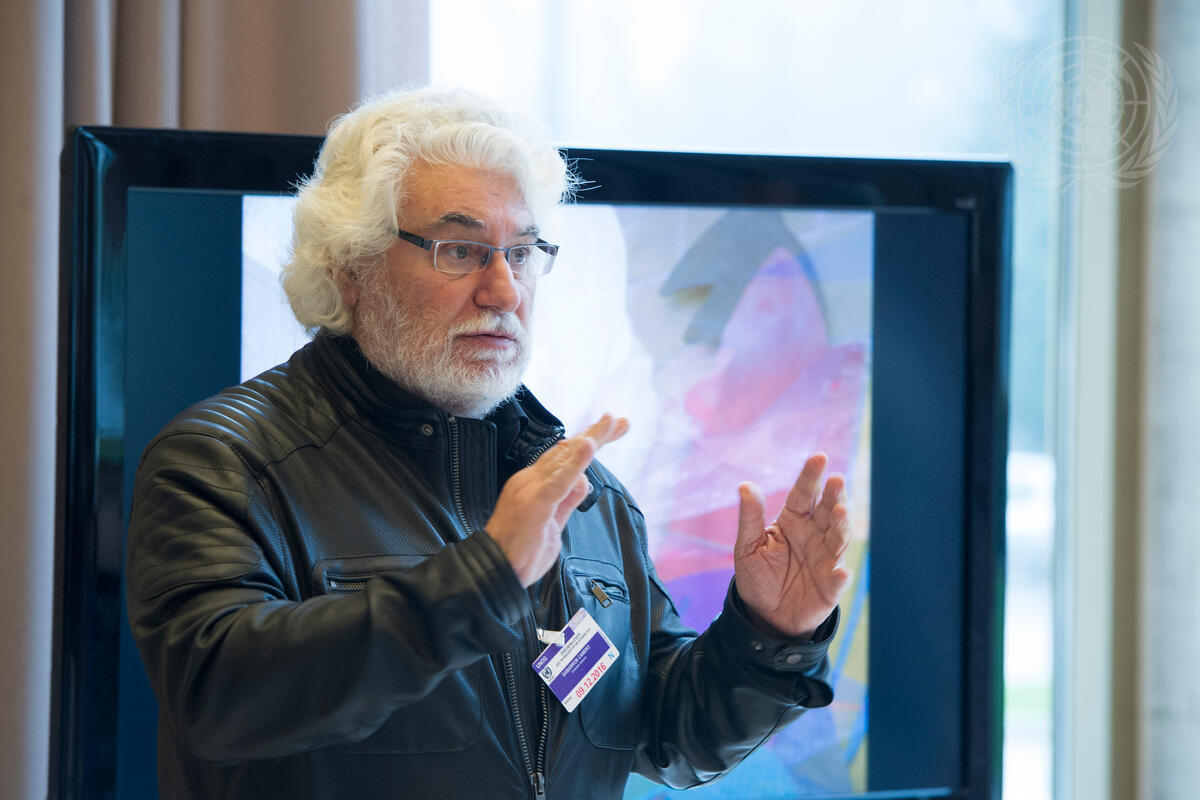 Spanish artist Cristóbal Gabarrón conducts a painting session with children at an event marking International Human Rights Day (10 December) at the Palais des Nations in Geneva.