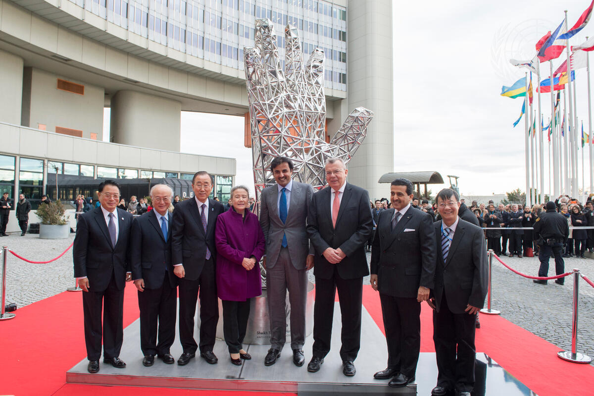 Secretary-General Ban Ki-moon (third from left) and his wife, Yoo Soon-taek, with Sheikh Tamim bin Hamad Al-Thani (centre right), Amir of the State of Qatar, at the unveiling ceremony. Also pictured: Yukiya Amano (second from left), Director-General of the International Atomic Energy Agency (IAEA); Yury Fedotov (third from right), Director-General of UNOV and Executive Director of the UN Office on Drugs and Crime (UNODC).
