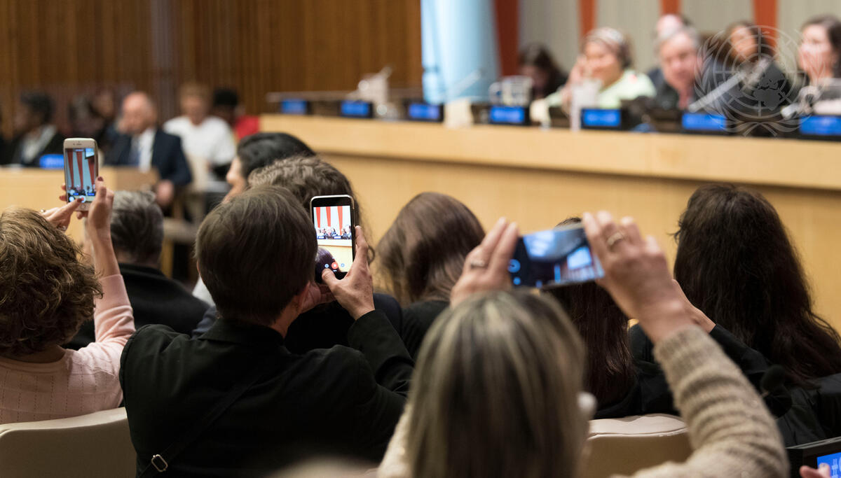 Participants take photos of the Secretary-General during the Town Hall meeting.