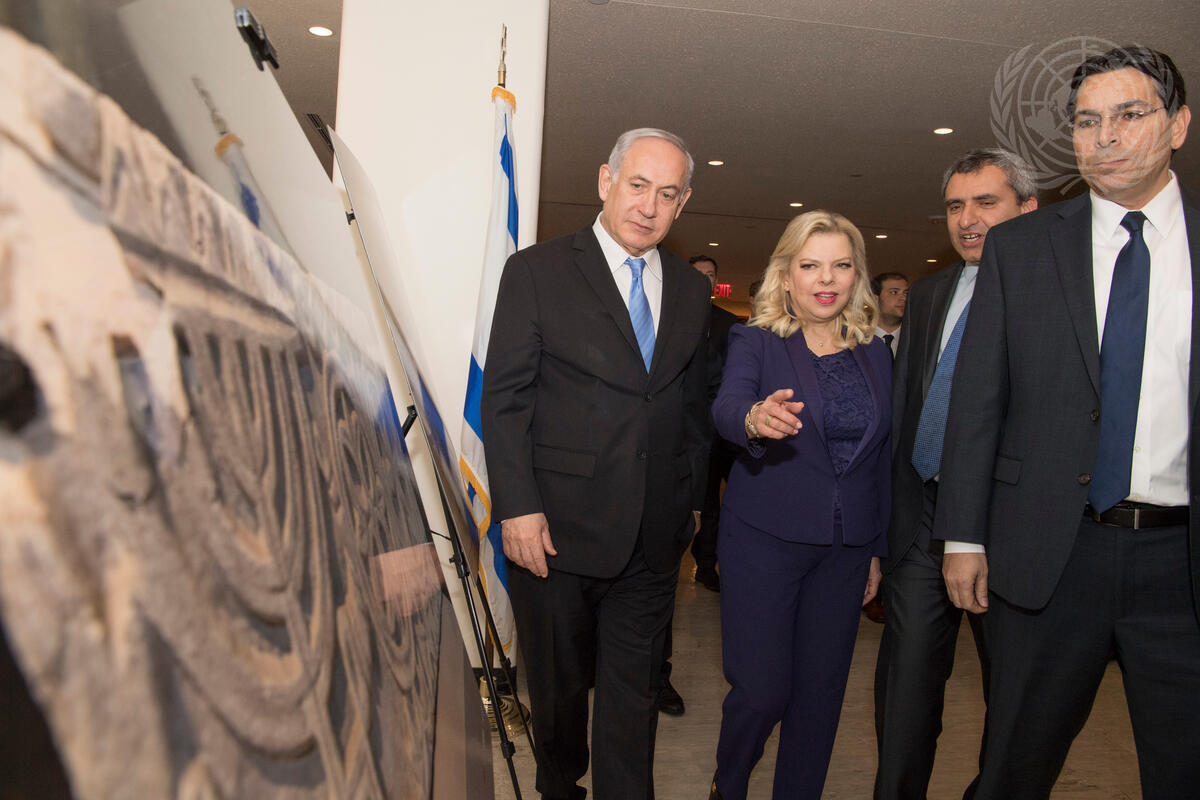 Israeli Prime Minister Benjamin Netanyahu (left) tours the exhibit ""3000 Years of History: Jews in Jerusalem"" at UN Headquarters in New York, along with his wife Sara Netanyahu (centre left) and Danny Danon (right), Permanent Representative of Israel to the UN.