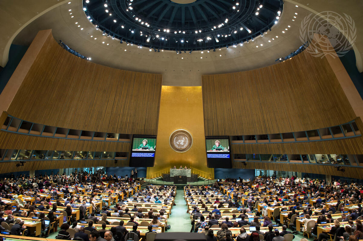 Wide view of the General Assembly Hall as Geraldine Byrne Nason (on screens), Permanent Representative of Ireland to the UN and Chair of the sixty-second session of the Commission on the Status of Women (CSW), addresses the opening meeting of CSW.