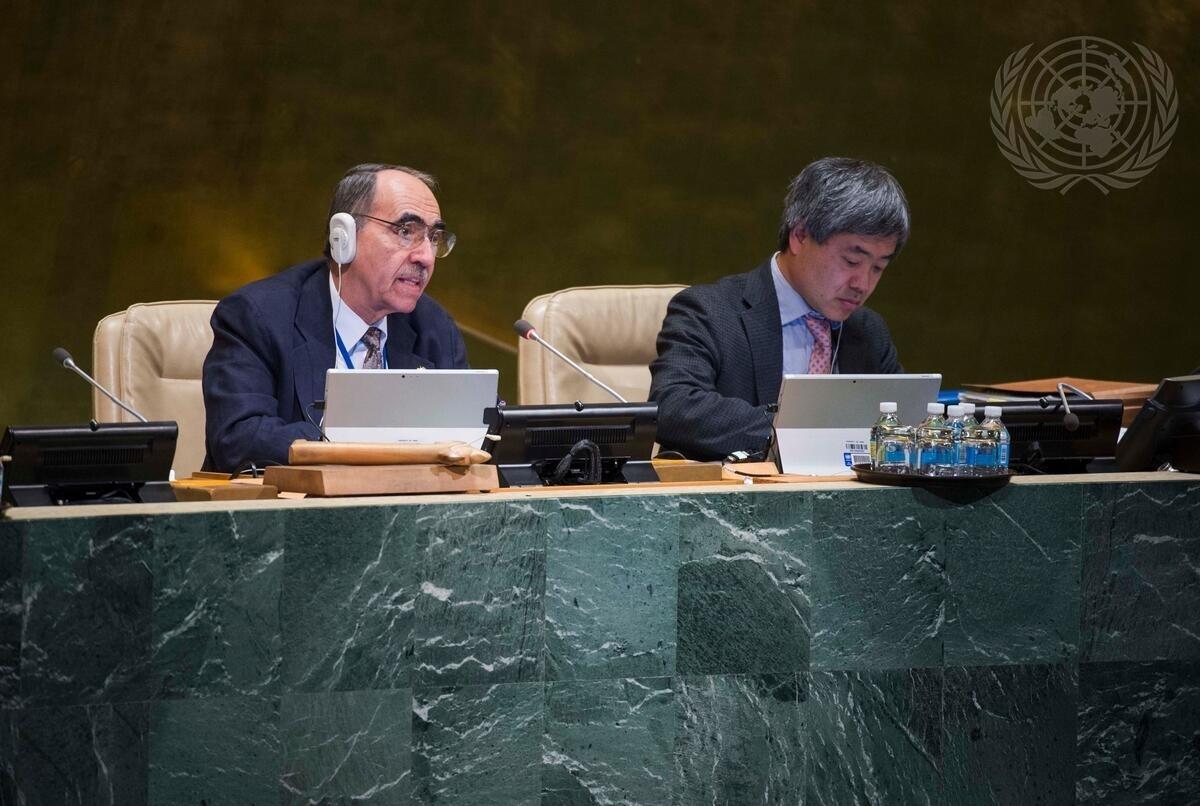 Rubén Ignacio Zamora Rivas (left), Permanent Representative of El Salvador to the UN and Vice-President of General Assembly, chairs the Assembly’s meeting on role of the United Nations in promoting a new global human order.