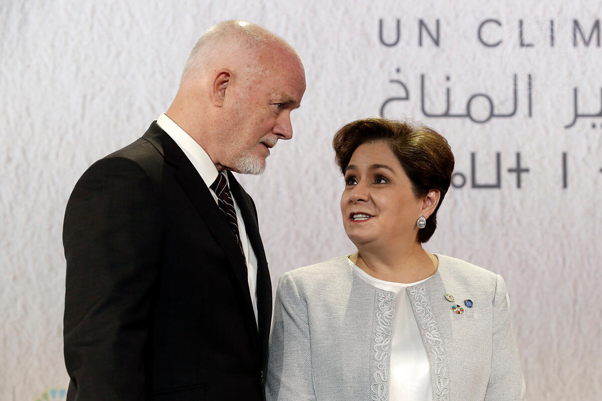 Peter Thomson, President of the seventy-first session of the General Assembly, speaks with Patricia Espinosa, Executive Secretary of the United Nations Framework Convention on Climate Change (UNFCCC), at the opening session of the high-level segment of COP 22 in Marrakech, Morocco.