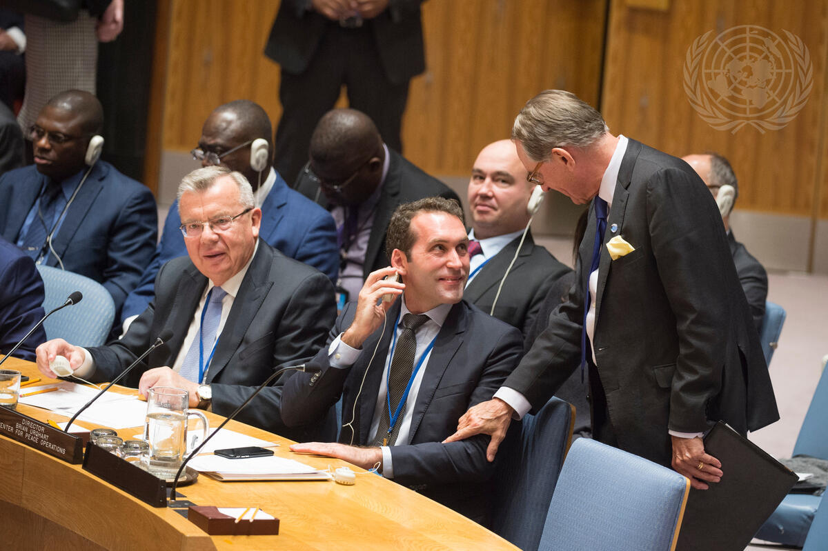 Deputy Secretary-General Jan Eliasson (right) greets Arthur Boutellis, Director of the Brian Urquhart Centre for Peace Operations, at the Security Council open debate on “Peace Operations Facing Asymmetrical Threats”. Also pictured, Yury Fedotov (front left), Executive Director of the UN Office on Drugs and Crime (UNODC).