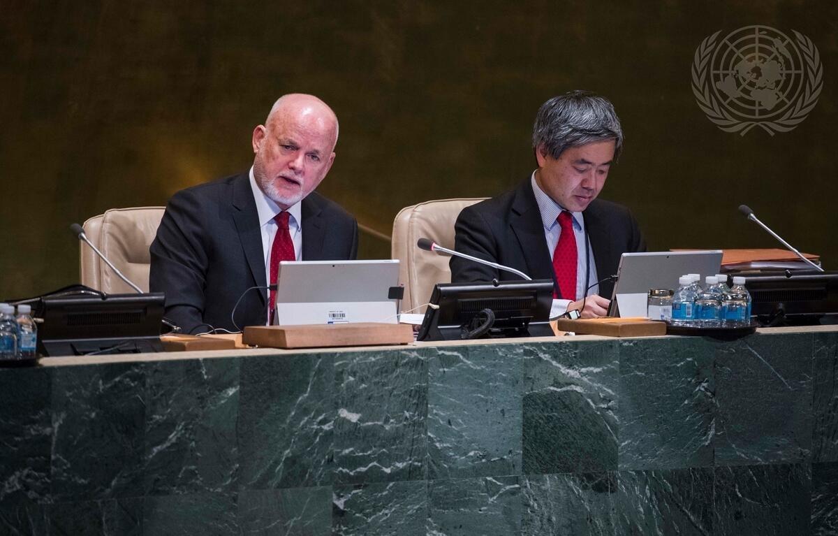 Peter Thomson (left), President of the seventy-first session of the General Assembly, chairs the Assembly’s meeting on the work of the of the International Criminal Tribunal for the Former Yugoslavia (ICTY) and the Mechanism for International Criminal Tribunals (MICT).