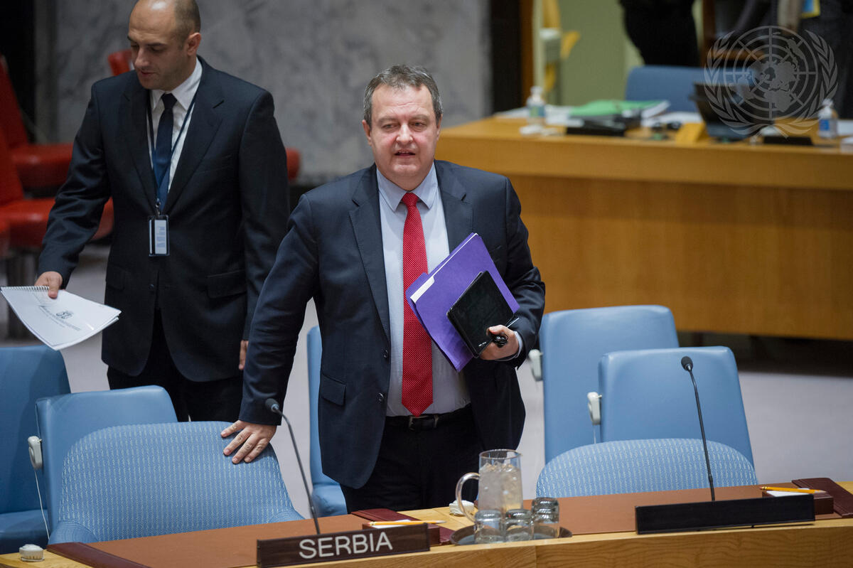 Ivica Dacic, First Deputy Prime Minister and Minister for Foreign Affairs of Serbia, takes his seat to address the Security Council meeting on Kosovo.