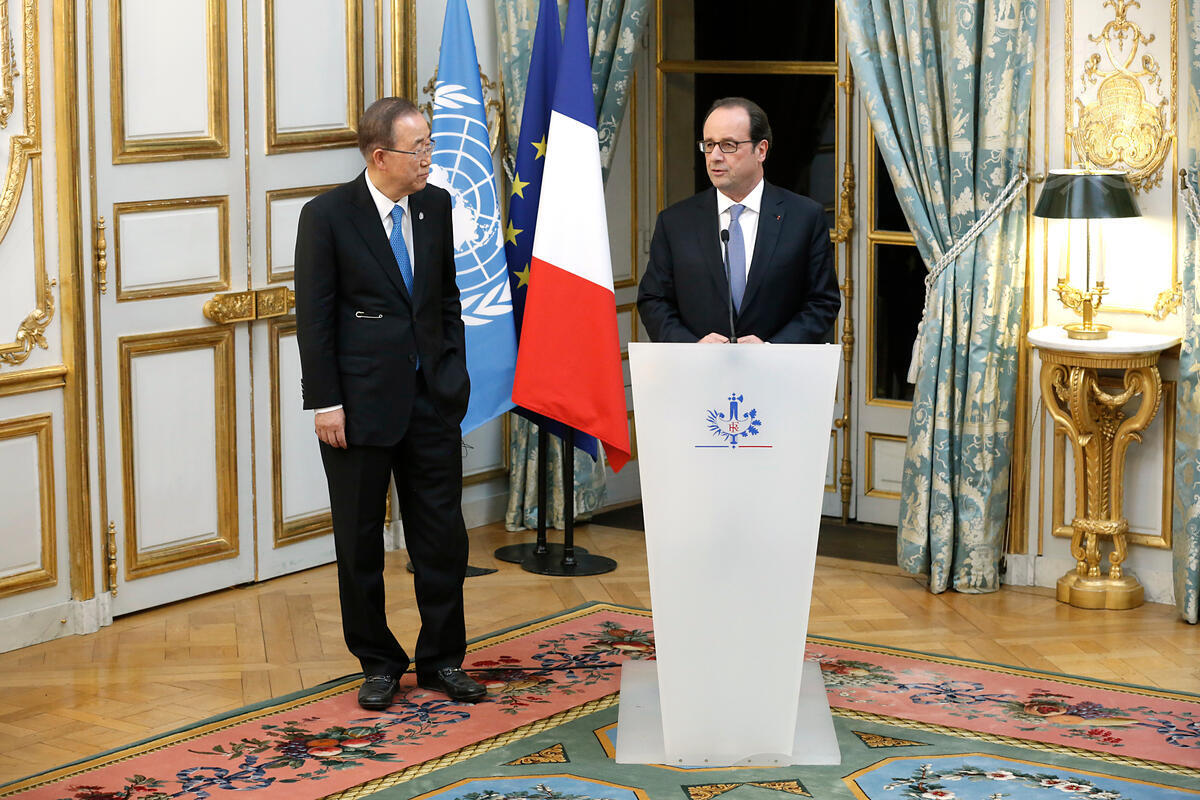 President Hollande (right) speaks during the ceremony, as the Secretary-General looks on.