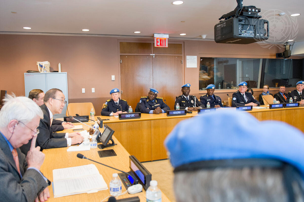 Secretary-General Ban Ki-moon (second from left) addresses the eleventh meeting of the Heads of the United Nations Police Components. Hervé Ladsous, United Nations Under-Secretary-General for Peacekeeping Operations is first from left.