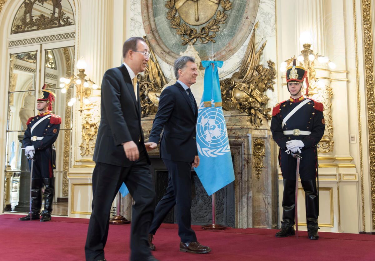Secretary-General Ban Ki-moon (centre left) meets with Mauricio Macri (centre right), President of Argentina, in Buenos Aires.