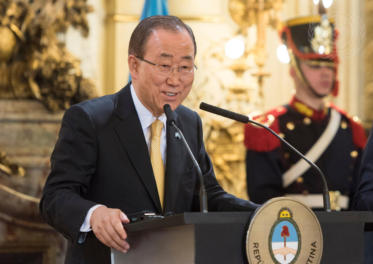 Secretary-General Ban Ki-moon addresses a joint press conference with Mauricio Macri, President of Argentina, in Buenos Aires.