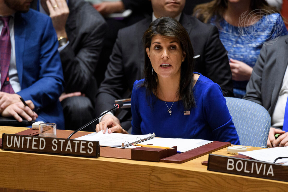 Nikki R. Haley, United States Permanent Representative to the UN, addresses the Security Council meeting on threats to international peace and security in relation to the situation in the Middle East, specifically Syria.