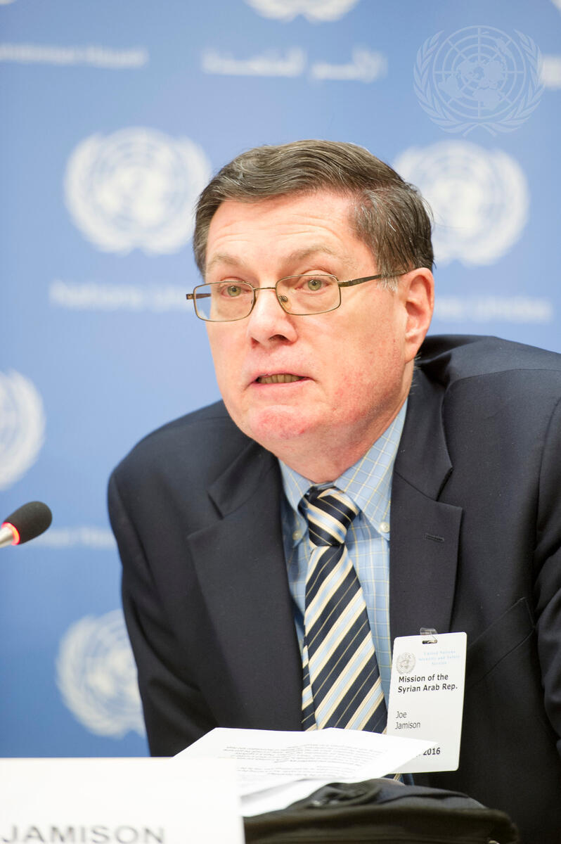 Joe Jamison, member of the Executive Board of the United States Peace Council and member of a recent delegation of US peace activists to Syria, briefs journalists on the group’s visit to that country. The briefing was sponsored by the Permanent Mission of the Syrian Arab Republic to the UN.