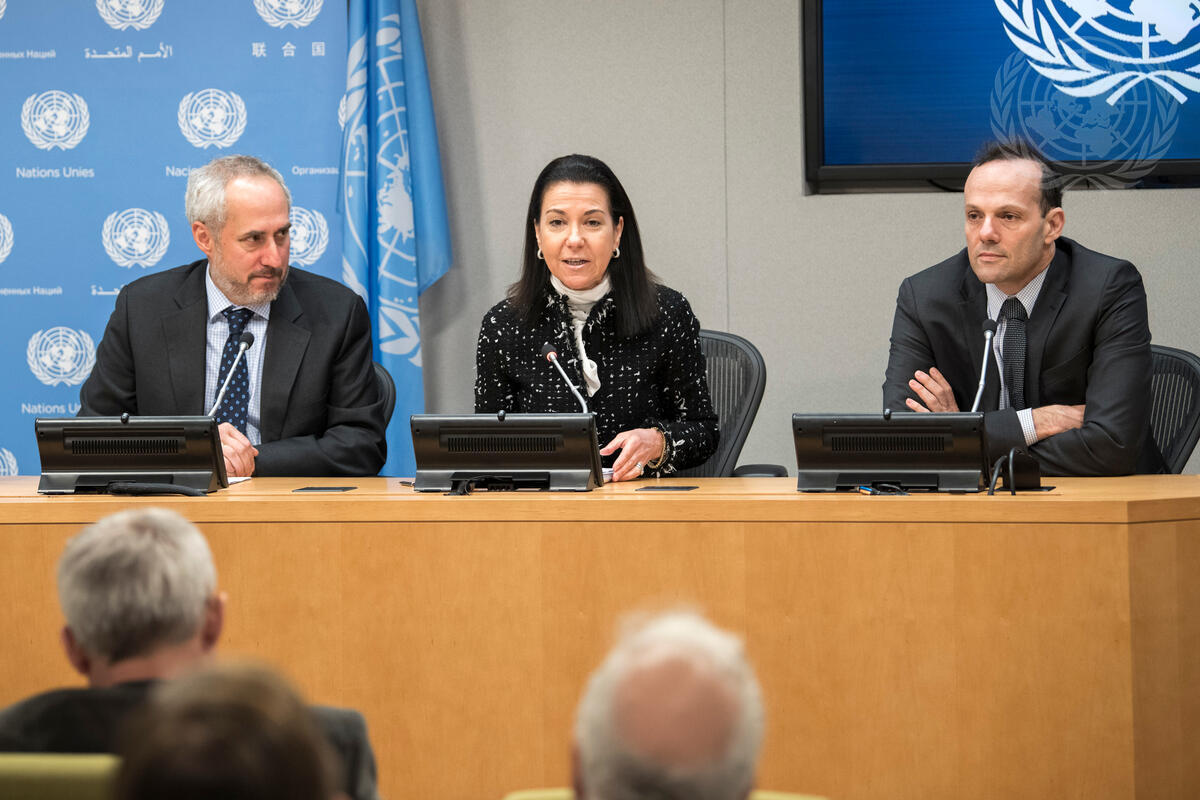 Michèle Coninsx (centre), Executive Director of the Counter-Terrorism Executive Directorate (CTED), briefs reporters on CTED’s latest trends report called “The challenge of returning and relocating foreign terrorist fighters: Research perspectives”.