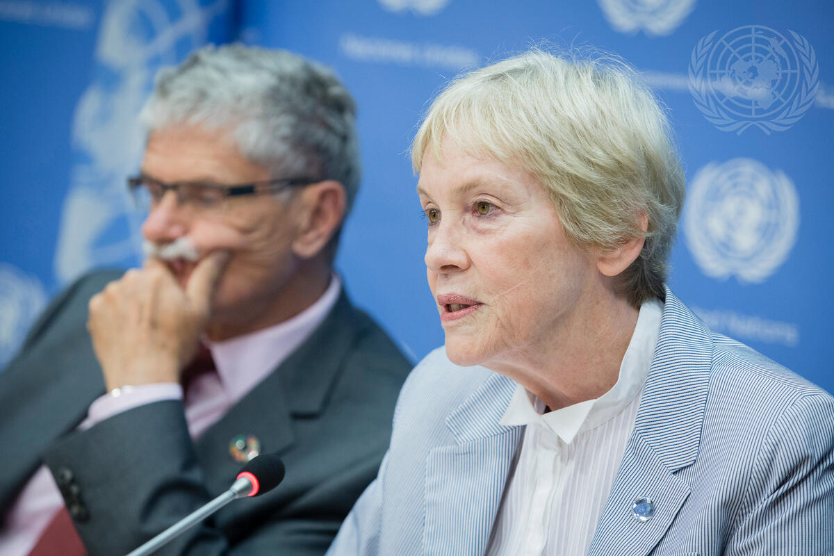 Karen Abuzayd (right), Special Adviser to the Secretary-General on the 19 September UN Summit on Addressing Large Movements of Refugees and Migrants, briefs journalists on the forthcoming Summit. Also addressing reporters with her was Mogens Lykketoft (left), President of the seventieth session of the General Assembly.