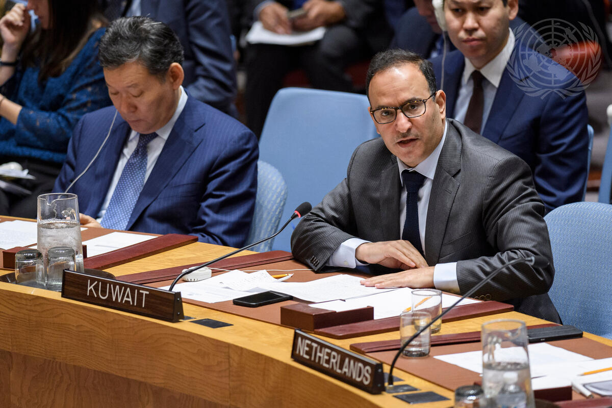 Mansour Al-Otaibi, Permanent Representative of Kuwait to the UN, addresses the Security Council meeting on threats to international peace and security in relation to the situation in the Middle East, specifically Syria.