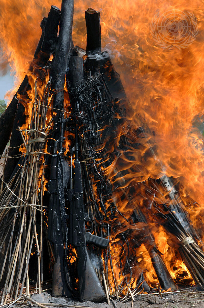 A stockpile of AK-47 rifles of the members of the Sudan People's Liberation Army burns at the launch of the Disarmament, Demobilisation and Reintegration (DDR) programme in southern Sudan by the United Nations Mission in Sudan (UNMIS).