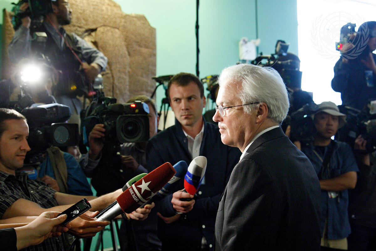 Vitaly I. Churkin, Permanent Representative of the Russian Federation to the United Nations, briefs journalists after closed consultations of the Security Council on Democratic Peoples Republic of Korea.