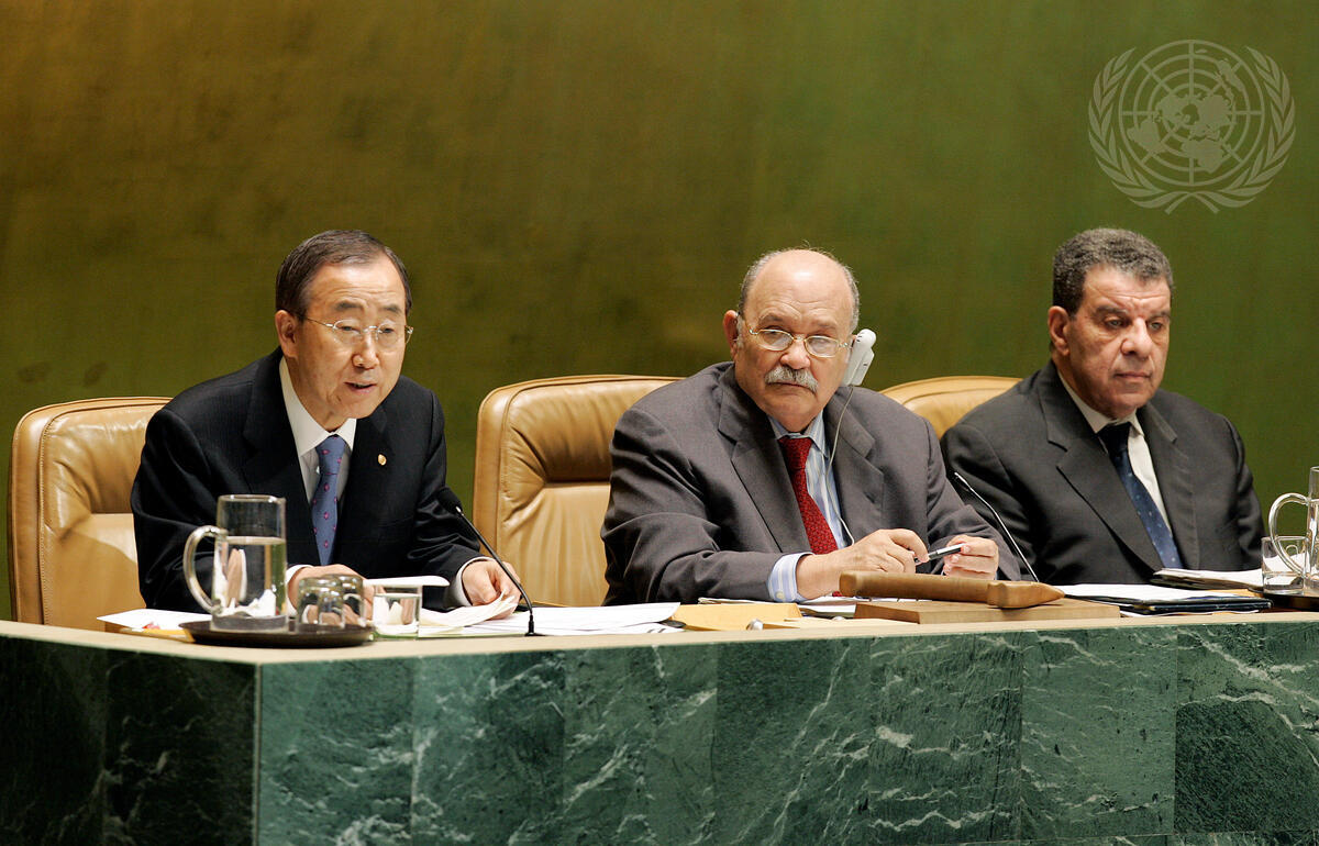 Secretary-General Ban Ki-moon (left) addresses a meeting of the General Assembly during the election of the President of the sixty-fourth session of the Assembly, as Miguel d'Escoto Brockmann (centre), President of the sixty-third session of the General Assembly; and Muhammad Shaaban, Under-Secretary-General for General Assembly Affairs and Conference Management, listen.