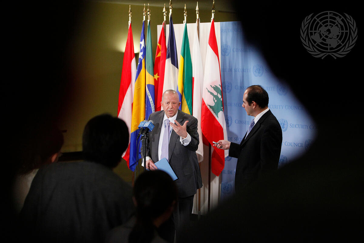 Claude Heller, Permanent Representative of Mexico to the UN and President of the Security Council for June, briefs reporters following the Council's meeting on the Middle East at which it adopted resolution 1934 (2010). The resolution extends the mandate of the United Nations Disengagement Observer Force (UNDOF)--tasked with monitoring the ""Blue Line"" (border) between Israel and Syria--until 31 December 2010.
