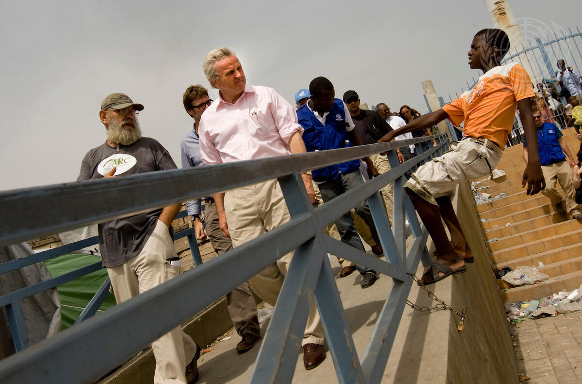A child plays on the railing as John Holmes (front, right), Under-Secretary-General for Humanitarian Affairs and Emergency Relief Coordinator, tours a camp for internally displaced persons (IDPs) in Port-au-Prince, Haiti. Mr. Holmes is on a two-day visit to Haiti to assess the situation in the country six months after a powerful earthquake left hundreds of thousands dead and over one million homeless.