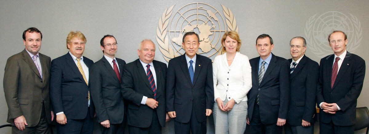 Secretary-General Ban Ki-moon (centre) meets with a delegation of the European Parliament's European People's Party (Christian Democrats). At right is Othmar Karas, Vice-Chairman of the Party.